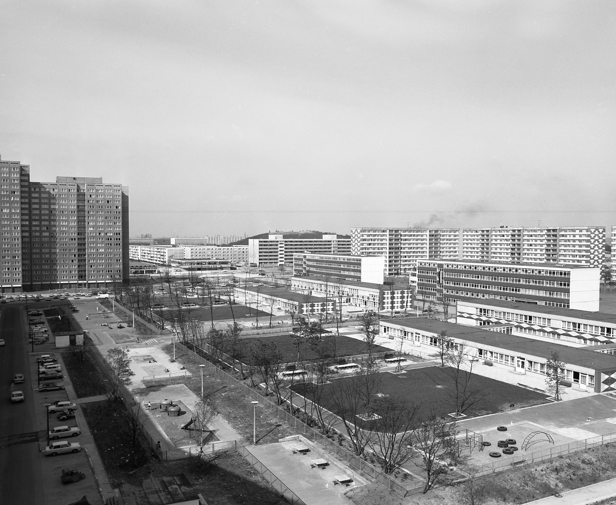 Dass hoch gebaut wurde, war nicht nur ein Tribut an die geplante hohe Besiedlungsdichte, sondern verfolgte auch weitere Ziele. Die großen „Wohnscheiben“ wurden über lange Strecken so angeordnet, dass sie große Wohnhöfe bildeten, die neben Grünanlagen auch Schulen und Kindergärten umschlossen. Die zehn bis elfgeschossigen Gebäude sollten dabei den Lärm des Verkehrs abschirmen. Die Wohnhochhäuser wurden wiederum gezielt so platziert, dass sie schon von weitem auf gesellschaftliche Bereiche, Verkehrsknoten und Nahverkehrshaltestellen aufmerksam machen (Balzer, 2023, S. 25–26).