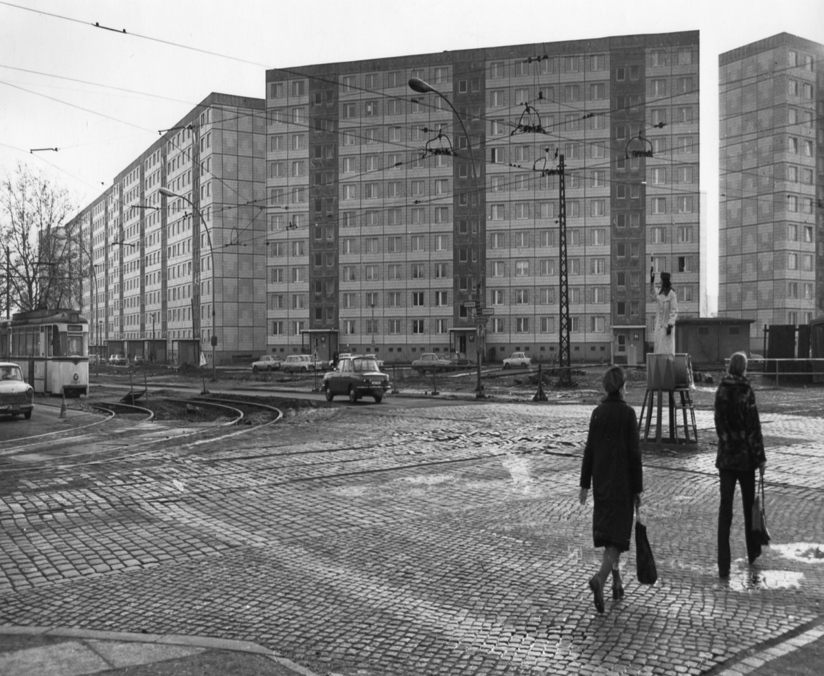 Abb. 10: Das Doppelwohnhochhaus am Roederplatz war 1972 das erste begonnene Wohngebäude in Fennpfuhl | © Museum Lichtenberg
